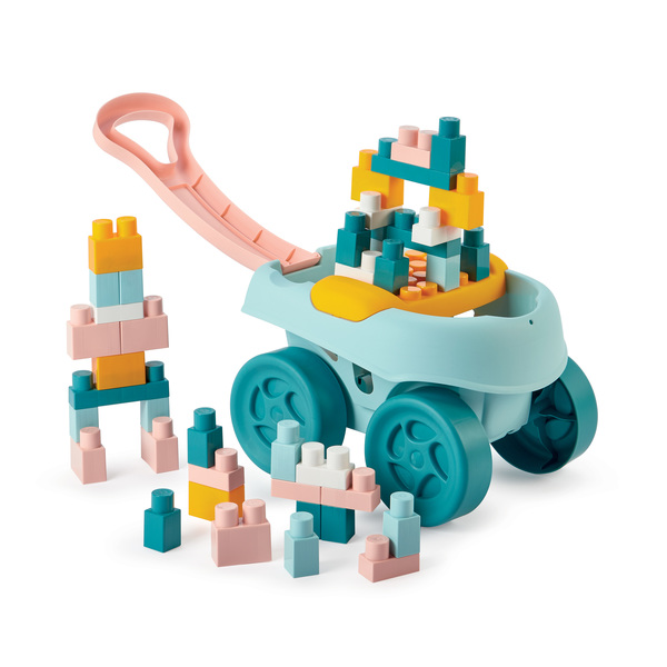 Découvrez ce chariot paré pour transporter partout ses jouets et les 40 briques de construction incluses.