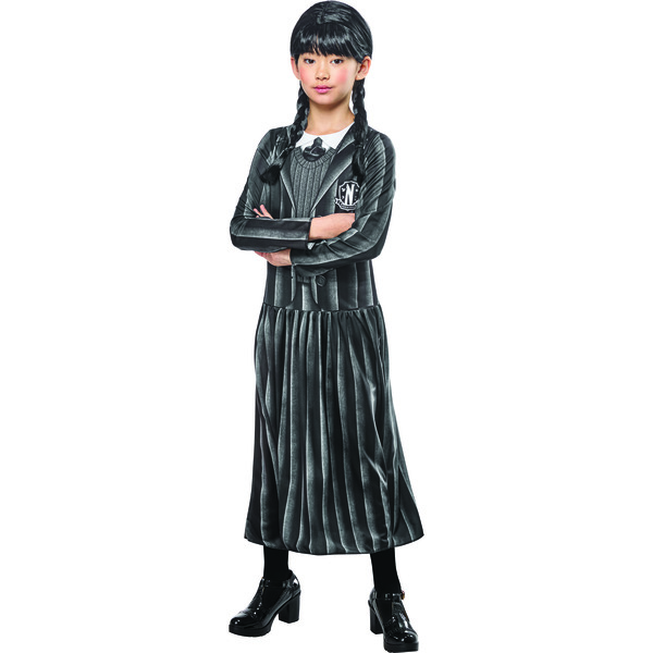 Plongez dans l’univers de la série Netflix Mercredi avec ce costume fidèle au style de Mercredi Adams. Cette tenue fera le bonheur de votre bambin lors d’une fête déguisée le jour de son anniversaire, pour carnaval, halloween ou tout simplement pour jouer et rêver lors d’une après-midi entre copains !