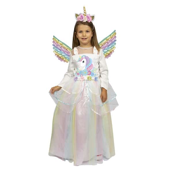 Votre enfant rentre dans l’univers des créatures féeriques avec son déguisement robe licorne manche longue pour enfant de 6 à 8 ans et ses accessoires !
