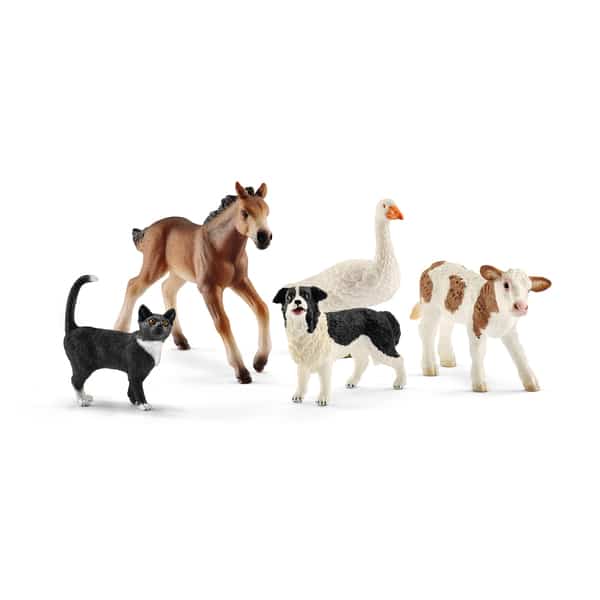 Au total, vous aurez 5 figurines : un veau Fleckvieh, un chat, un chien border collie, une oie et un poulain mustang.
