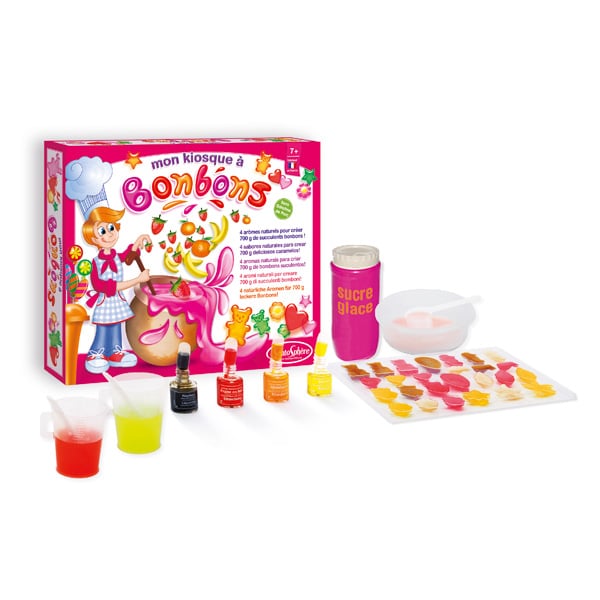 Avec mon kiosque à bonbons, les enfants peuvent maintenant créer leurs propres bonbons avec ce mini atelier de confiseries à fabriquer. A base de gélatine, avec des arômes naturels, sans conservateurs, ce mini-laboratoire permet aux enfants de réaliser 700g de délicieux bonbons. Aux formes multiples et délicieusement aromatisés, ils sont une invitation à la gourmandise. Contenu : – 4 arômes naturels (essence de mandarine, arômes naturels de banane, réglisse et de fraise des bois) – 1 pot d’acide d’agrumes naturels – 1 moule avec 24 empreintes et 12 formes différentes – 1 bécher – 1 cuillère doseuse – 4 pipettes – 3 sachets de 20 g de gélatine – 1 pot de mélange – 1 mini-cuillère – 1 notice. Le sucre n’est pas fourni dans le coffret. Un jeu éducatif pour éveiller et ravir les gourmands. Recharge disponible référence 113434.