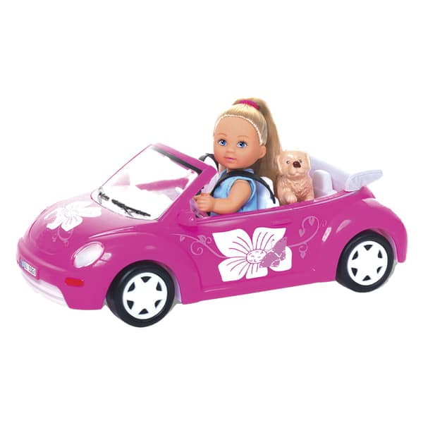 Envie d’une virée en voiture ? La petite poupée Lolly peut partir faire une balade au volant de sa voiture style New Beetle avec son chien. La poupée mannequin de 12 cm peut accrocher sa ceinture et placer son chien à l’arrière de la voiture. En jouant, votre enfant développe son imagination et invente de belles aventures avec sa poupée mannequin. La voiture New Beetle mesure 23 cm.