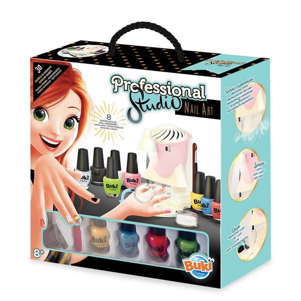 Avec ce salon de manucure, votre enfant pourra laisser libre cours à sa créativité pour décorer les ongles de toute la famille ! Des tutoriels sont inclus pour permettre à l’artiste de reproduire les modèles pas à pas. Tout le matériel nécessaire au nail art est fourni : – 8 pots de vernis (mat, pailleté, etc.) – un séchoir à ongles équipé d’une lumière et d’une loupe – petit matériel pour la manucure (lime, bâtonnets, pinceau, etc.) – décorations autocollantes – 30 fiches illustrées et dotées d’un QR Code pour visionner les vidéos en ligne. Fonctionne avec deux piles LR06 (non incluses).
