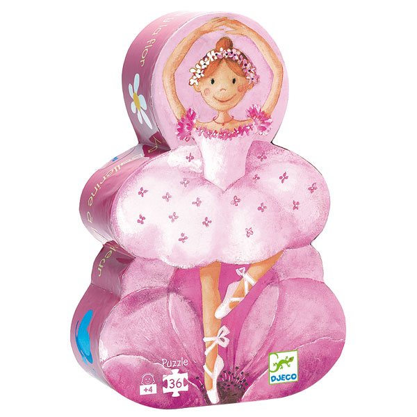 Une jolie boîte en forme de silhouette de ballerine et un puzzle de 36 pièces représentant une belle scène de ballet.