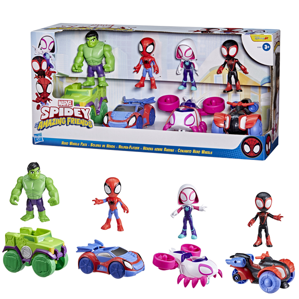 Plongez dans l’univers palpitant de Spidey et ses Amis Extraordinaires avec ce superbe coffret comprenant quatre figurines articulées Marvel d’environ 11 cm, conçues pour offrir un jeu riche en action et en imagination. Chaque figurine possède plusieurs points d’articulation, ce qui permet aux enfants de les positionner dans des poses dynamiques et de recréer leurs scènes préférées de la série animée à succès de Disney Junior. Ce set exceptionnel inclut quatre véhicules inspirés des héros : le Spidey Web Crawler, parfait pour filer à toute vitesse sur les routes ; le Ghost-Spider Copter, un hélicoptère stylé pour des missions aériennes spectaculaires ; le Miles “Spin” Morales Techno Racer, un bolide high-tech pour des courses effrénées ; et le Hulk Smash Truck, un puissant camion prêt à foncer dans l’action et à démolir les obstacles. Grâce à un design et une décoration fidèles à la série, chaque véhicule et figurine reflète parfaitement l’esprit et l’énergie des personnages. Les enfants peuvent inventer des aventures inédites, sauver la ville, affronter les méchants et coopérer pour résoudre des situations dangereuses. Ce pack est idéal pour stimuler la créativité et le jeu de rôle tout en offrant des heures de divertissement. Parfait pour enrichir la collection des jeunes fans de super-héros, il leur permettra de revivre les aventures trépidantes de Spidey, Ghost-Spider, Miles Morales et Hulk, seuls ou avec leurs amis, et de devenir les héros de leurs propres histoires.